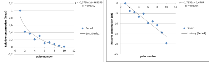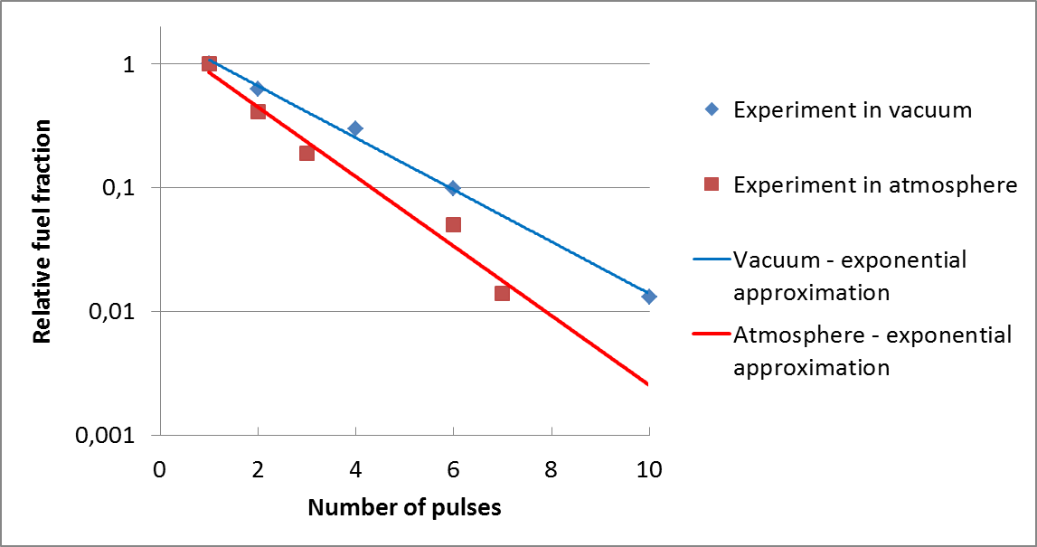 Przedstawione pomiary potwierdzają logarytmiczny spadek koncentracji cząsteczek paliwa w zależności od ilości oddanych impulsów, który łatwo można aproksymować odpowiednią (przedstawioną na wykresie) funkcją. Świadczy to o termicznym charakterze usuwania składnika gazowego z obszarów warstwy położonych poniżej powierzchni oddziaływania.