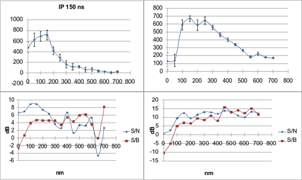 Badania (2), mające na celu zbadanie plazmy wolframowej i oszacowanie efektów powierzchniowych oddziaływań dwu-impulsowych prowadzone były w warunkach próżniowych przy użyciu parametrów wiązki laserowej analogicznych do zastosowanych w przypadku badań usuwania paliwa opisanych w poprzednim punkcie. Eksperymenty polegały na rejestracji kolejnych widm z krótkim czasem otwarcia bramki (wynoszącym 50 ns), przy przesuwającym się opóźnieniu otwarcia bramki z krokiem o długości 50 ns w zakresie od 0 do 500 ns. Kolejne serie pomiarowe były wykonywane dla zmieniającego się opóźnienia między-impulsowego wynoszącego od 0 do 650 ns ze zmiennym krokiem. Następnie rozpatrywane były różne linie wolframowe w celu zbadania ewolucji ich natężenia, oraz stosunków sygnału do szumu i sygnału do tła (S/N, S/B). Przykładowe wykresy ilustrujące zachowanie się linii WII 364,1 i WI 429,5 nm dla opóźnienia między-impulsowego wynoszącego 150 ns przedstawione są na rysunku nr 3.