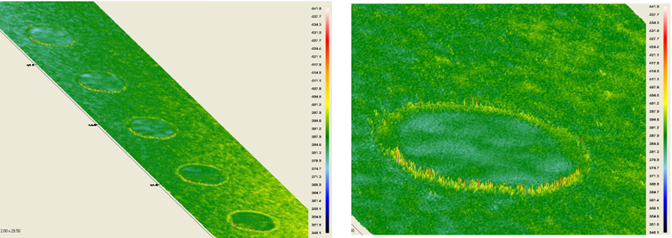 W badaniach nad powierzchniowymi efektami oddziaływania laserowego za pomocą profilometru optycznego NANOVEA stwierdzono, że w fundamentalny sposób różnią się one w przypadku warstw oraz podłoża. W przypadku warstw, współczynnik ablacji dla impulsów rzędu 50 – 100 mJ ma wartość 0,5 do 1 μm, a dla impulsów o wyższych energiach często dochodzi do defoliacji, czyli lokalnej utraty całej warstwy. W przypadku oddziaływania z podłożem wolframowym współczynnik ablacji dla impulsów 100 mJ, w warunkach eksperymentalnych nie przekraczał 100 nm na impuls. Oddziaływania nie prowadziły przy tym do powstawania krateru o kształcie gaussowskim, lecz płaskich, o chropowatości nie odbiegającej od chropowatości otaczającego je obszaru. W największym stopniu modyfikacji ulegał przy tym brzeg krateru, na którym powstawał obszar ostrego zafalowania materiału (tzw. burr), które jest charakterystyczne dla oddziaływań nanosekundowych i rośnie wraz ilością impulsów zdeponowanych w jedno miejsce na skutek akumulacji drobnych efektów związanych z rozszerzalnością termiczną. Głębokość powstałych kraterów w niewielkim stopniu zależała od odstępu między-impulsowego.
