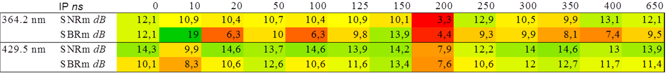 Uchwycone na rysunku różnice ewolucji linii atomowych i jonowych dobrze ilustrują zachowanie plazmy, w której składniki zjonizowane dominują na wczesnym etapie rozlotu, na skutek czego trudniej jest je wyodrębnić z wysokiego na tym etapie tła. Dzięki temu, obserwacja ta umożliwia optymalizację doboru czasu opóźnienia dla pomiarów różnych składników plazmy w zależności od ich stopnia jonizacji. Badania umożliwiły również optymalizację odstępu między-impulsowego dla wolframu na podstawie porównania stosunku sygnału do szumu oraz tła dla kolejnych jego wartości. Przykładowa analiza dla wspomnianych wcześniej przedstawiona jest w poniższej tabeli.